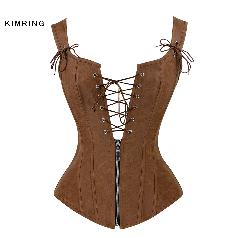 For Sale Kimring Sexy Steampunk Corset Retro Faux Leather Brown Corset Overbust Lace Up Back Vest Corset Body Shaper Corselet for Women,Price : US $32